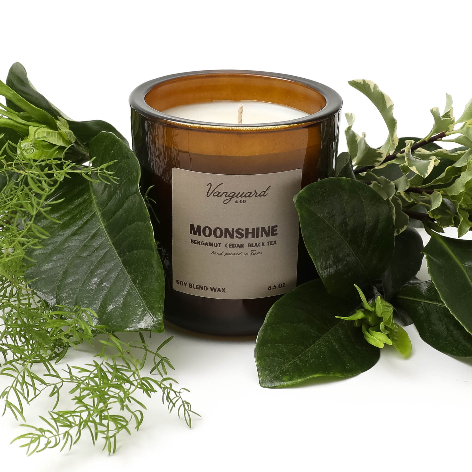 Envelop yourself in the enchanting twilight created by "Moonshine," where the bright and uplifting aura of bergamot is gracefully complemented by the grounding presence of cedar and the soothing touch of black tea. Allow the fragrance to transport you to a place of refined tranquility as you bask in the celestial glow of this captivating candle.